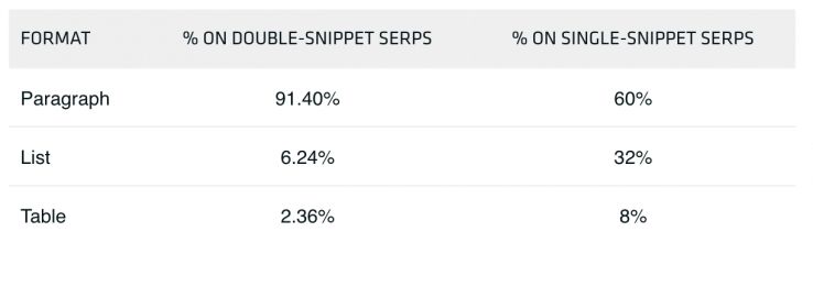 While Google’s order of preference is the same for both — paragraphs, lists, and then tables — paragraph formatting was the clear favorite on our two-snippet SERPs.