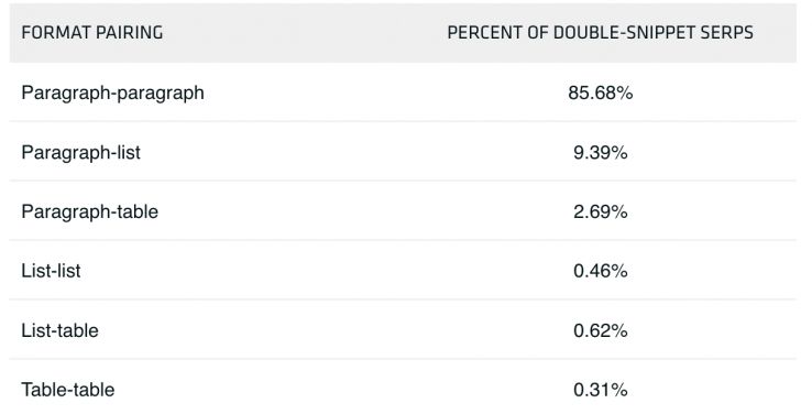 It follows, then, that the most common pairing of snippets was paragraph-paragraph — this appeared on 85.68 percent of our SERPs. The least common, at 0.31 percent, was the table-table coupling.