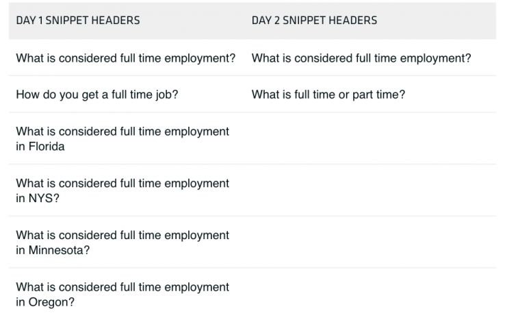 Our best hypothesis is that searchers in Florida, NYS, Minnesota, and Oregon have more questions about full-time employment than other places. But, since we’d performed a nation-wide search, Google seems to have thought better of including location-specific snippets.