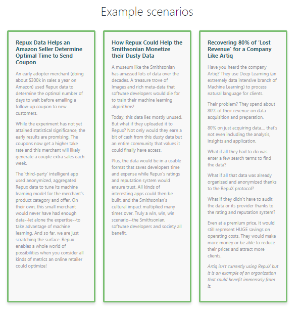 Repux is a marketplace that lets small and medium businesses sell anonymized data to developers. The developers use the data to build “artificially intelligent” apps, which they then sell back to businesses. Business owners and managers use the apps to make better business decisions.
