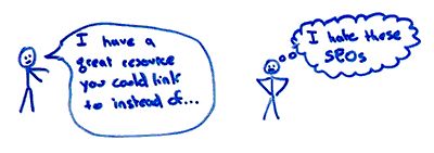 So the problem is I think that most of the web at this point is sort of burned out on this conversation of, "Hey, I have this great resource." Or, "Hey, you linked to this thing which is currently broken and so maybe you'd like to," or "Hey, I noticed that you frequently mention or link to blah, blah, blah. Well I have a blah, blah, blah like blah, blah, blah."