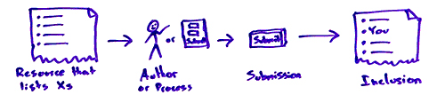 So this is rather than saying, "I would like a link," it's a very indirect or a relatively indirect ploy for the same thing. You find resources that list Xs, and there's usually either an author or some process for submission, but you don't have to beg for links. You can instead just say, "I fit your criteria."