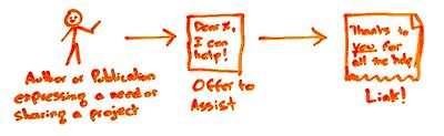 So there's some existing content that you find on the web, you locate the author of that content or the publisher of that content, and you form a connection, usually through social, through email, or through a direct comment on that content. You have an additional resource of some kind that is likely to be included, either in that particular element or in a future element.