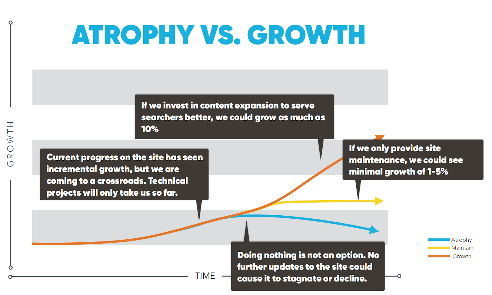 We developed a visual tool that helps us quickly explain to clients that active optimization and expansion can lead to growth (we forecast an estimate of impact based on their budget, their industry, their business goals, the initiatives we plan to prioritize, etc.), small maintenance could at least uphold what we’ve done but the site will likely stagnate, and to do nothing at all could lead to atrophy and decline as their competitors keep optimizing and surpass them.
