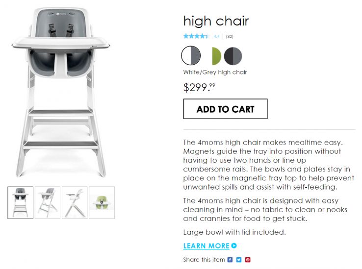 This high chair example from 4moms.com focuses on the three things that matter to their audience: single-handed adjustments, spilt-food prevention, and easy cleanup.