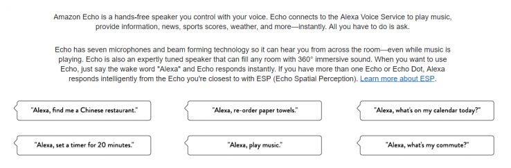 The Amazon Echo sales page does a great job of focusing less on the technical features of the product, and more on the cool things you can do with it.