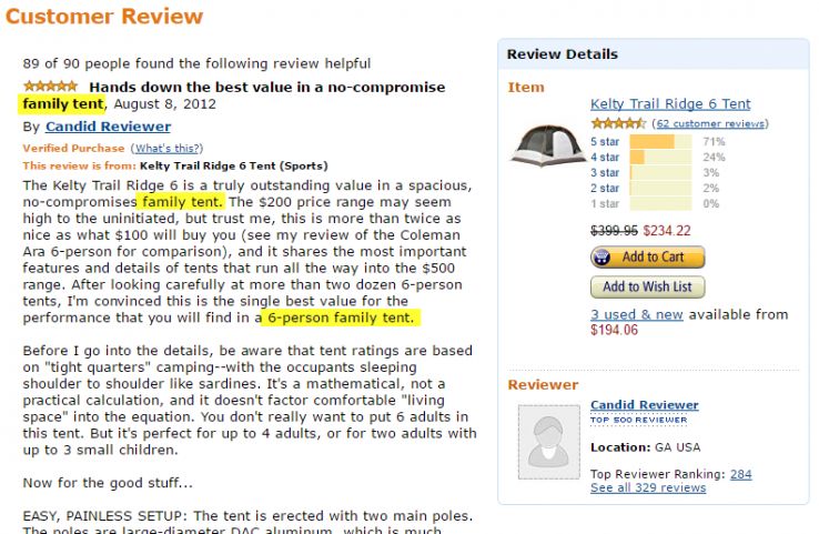 There’s an opportunity here for a competitor in the tent or outdoor space to improve their own product descriptions for the same tent (or even put together a larger guide to family tents).