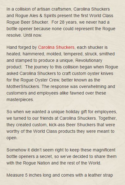 The folks over at Rogue Brewing understand that the people buying gifts from their website are probably passionate about well-made products, not just well-made beer. Here’s a great example from their site that tells the story of their 28-year search for a decent beer shucker (bottle opener):