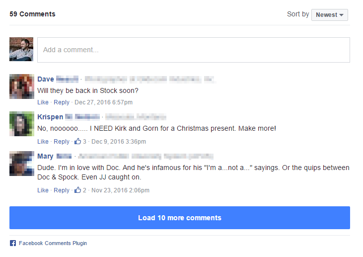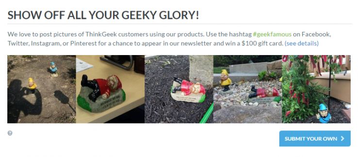 In this example from ThinkGeek, they’ve opted to just let people leave Facebook comments rather than any product reviews at all. Which makes sense, because they’re Star Trek garden gnomes, and it’s not like you need to tell people whether they were the right size or not. Even better than Facebook comments, they also solicit product photos via social media on their #geekfamous hashtag.