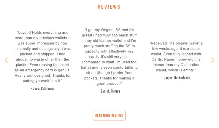 Here’s another example where my favorite wallet company, SlimFold, simply highlights great product reviews that they received from press and customer emails. While it makes it harder for them to solicit new reviews, they only have a handful of products, and this format allows them to put more emphasis on specific reviews.