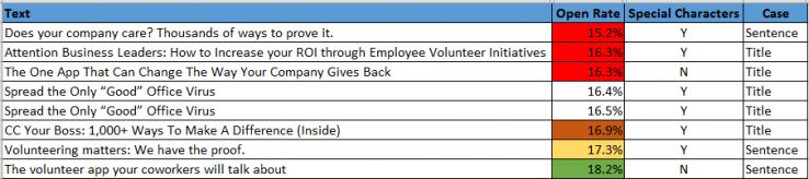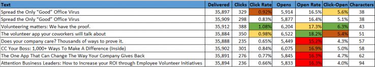 Our highest open rate subject line (18.2%), " The volunteer app your coworkers will talk about" did not win in terms of either overall clicks (0.98%) or click-to-open rate (5.4%). This tells me two things: