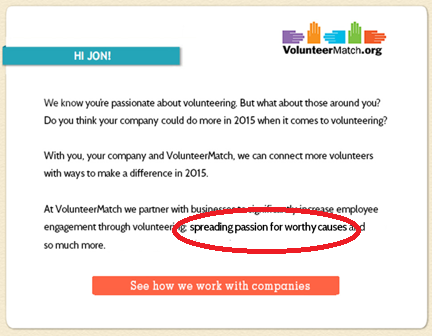 For this VolunteerMatch email test, the body copy of all emails was identical except for one sentence; that one sentence had four different variations that were written to map to the six test (and one control) subject lines.