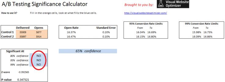 In the chart below, you can see that these slight variations in open rate between the two test cells are not statistically significant; a very important signal that the total data set from the test is valid, too.