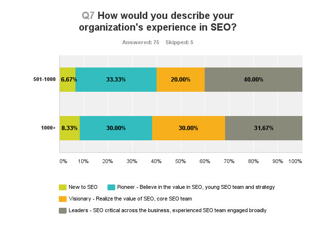Interestingly, in larger companies we also see less confidence in the team’s experience in SEO. Of the companies with in-house SEO, only 31.67% of large enterprise teams called themselves “leaders” in the SEO space, which was defined in this survey as part of a team engaged broadly and critically within the business. 40% of small enterprise teams called themselves “leaders.” In terms of viewing themselves more positively (leaders, visionaries) or less (SEO pioneers in their company or else new SEO teams), we did not notice a big difference between small or large enterprise in-house SEO teams.