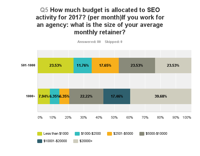 Before going too far in making assumptions about their increased resources, we made sure to ask our survey-takers about this. Specifically, we asked for how much budget is allocated to SEO activity per month — not including the cost of employees’ salaries, or the overhead costs of keeping the lights on — since this would result in a figure easier to report consistently across all survey takers.