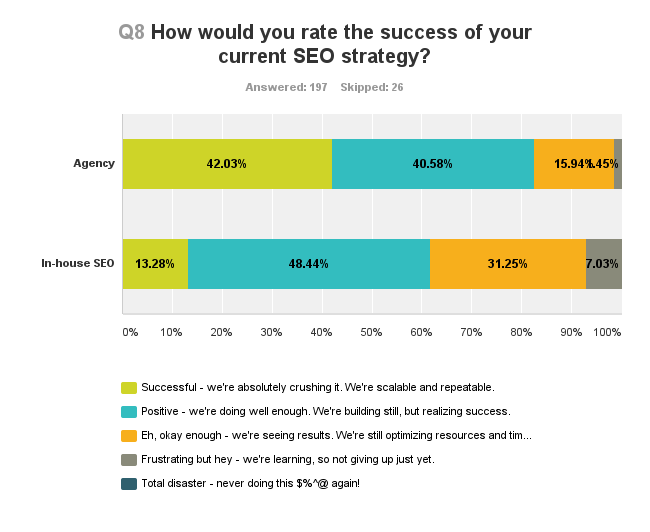 While nobody said their strategy was a total disaster — we clearly keep awesome company — 7% of in-house SEOs expressed frustration with their strategy, as opposed to only 1% of agencies.