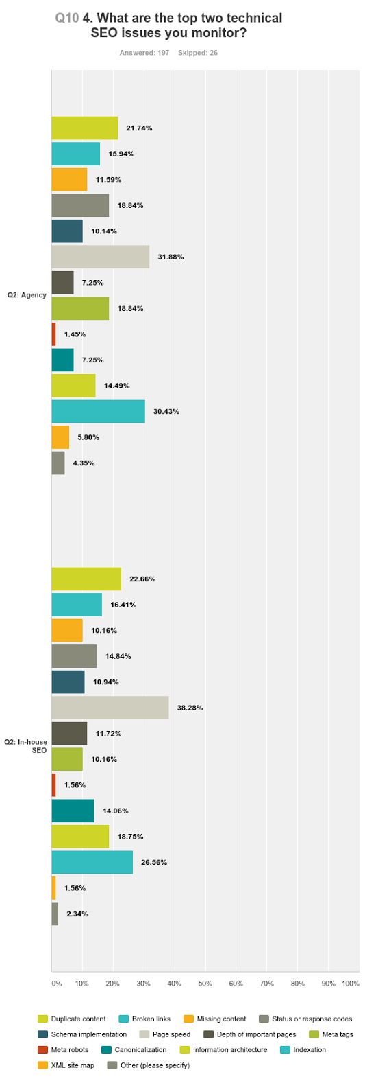 One question that we asked of survey takers was about the top two technical SEO issues they monitor: