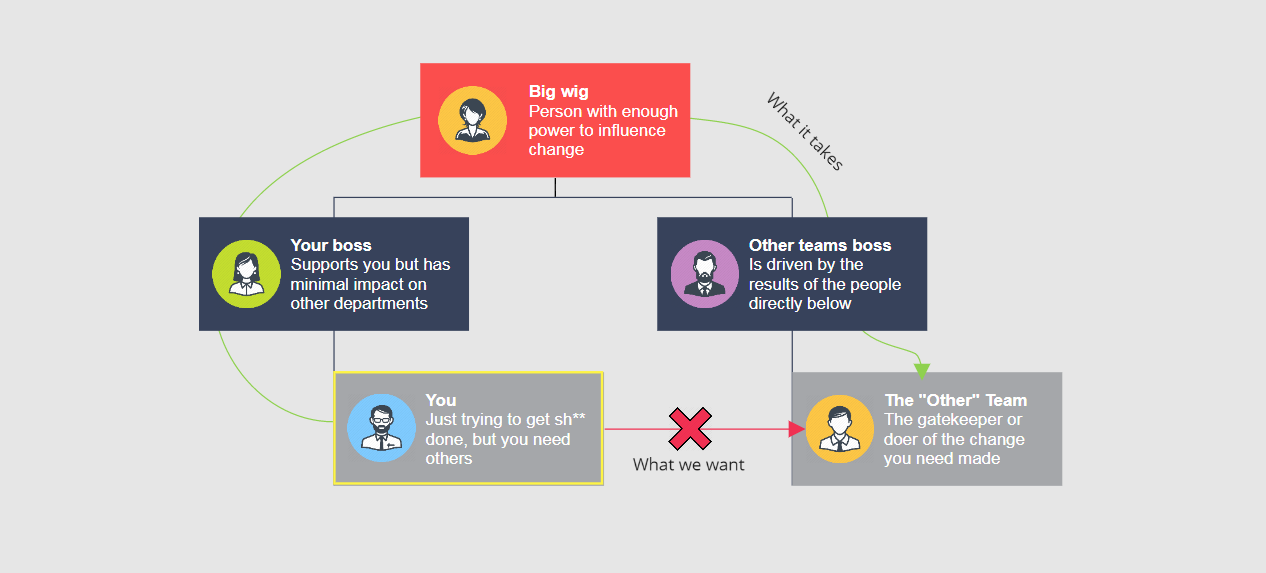 For a real-world example, I’ve presented challenges and opportunities to Senior VPs and CMOs at Fortune 100 companies where executives have said, “Wow this is a huge opportunity. Why haven’t we done this yet?" and our main client contact responds, “Because XX department hasn't been tasked with supporting us from their management, so this isn't their problem.” That’s where the politics really start to come in. You typically need to go high enough up the marketing department ladder to convince someone with power to back your initiative and direct people outside of your department to support you, holding those other people accountable for the results of the team.