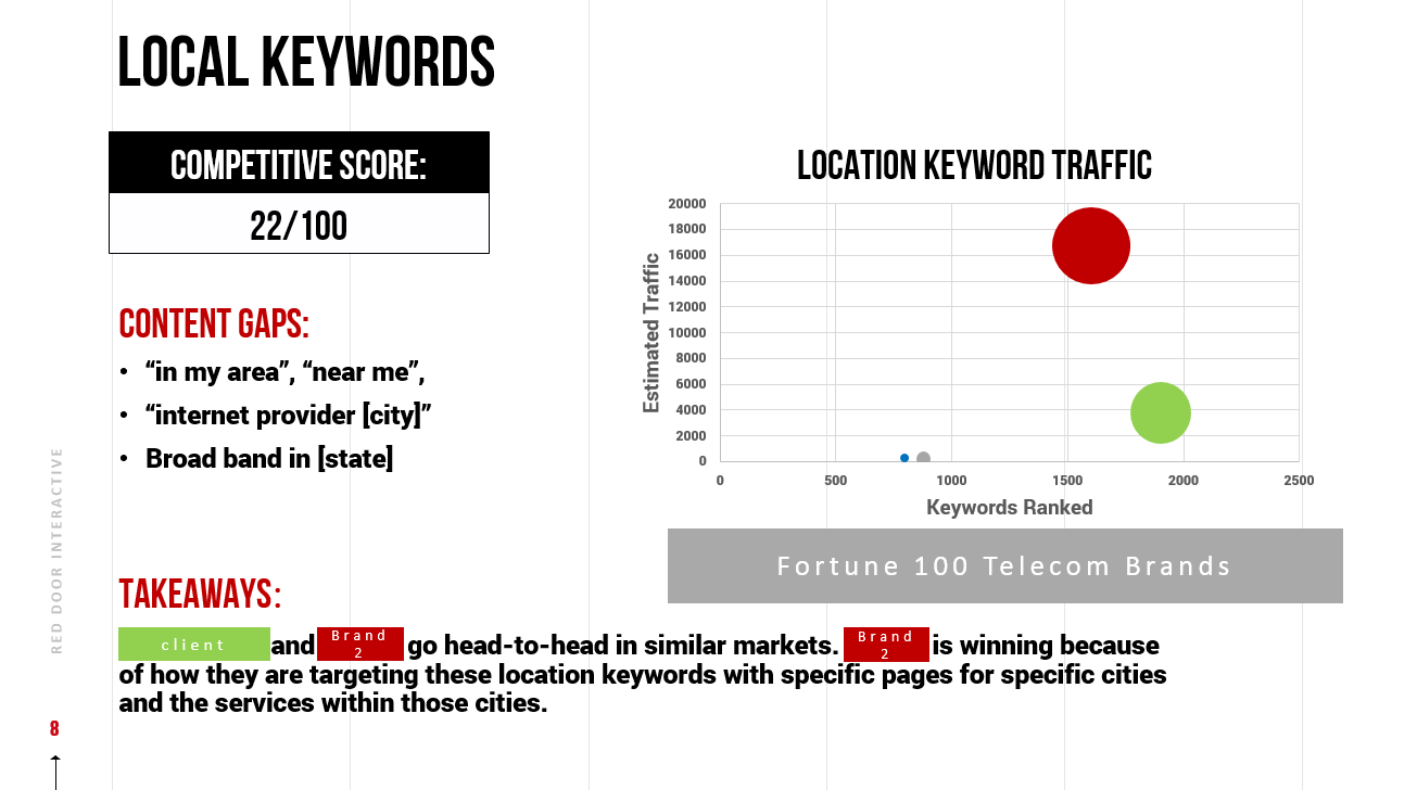Working in the agency world, the pressure for our recommendations to have a return is extremely high because those recommendations are measured against the cost of the retainer, even when the project might be something that tends to have a negative impact, like a domain migration. At RDI, the closest thing we have to a secret sauce for this is our Content Gap Analysis. Here’s a sample of how we present findings to clients: