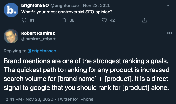 So we've been preaching about this for a while, and then literally two days ago I saw this tweet. A team in the UK was asking about controversial SEO opinions. And the SEO manager for Ticketmaster came out and said this. He believes that when Google sees people searching for your brand name alongside a query, they start ranking you higher for the non-branded terms. And I don't think this is controversial. And in fact, one of the replies to this was from Rand Fishkin, the founder of Moz. He also now believes that the brand signals are more powerful than what links and keywords can do.