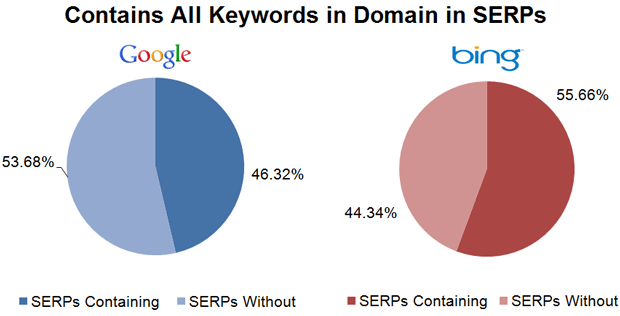 No surprise it's keyword-in-the-domain matches (but not necessarily exact). So, in the first pie chart set, we'd say that for the query "org chart" only orgchart.* type domains would count. In the second, something like myorgcharts.com, greatorgcharts.net, etc. would fit the pattern. These appear in around half of all SERPs on both engines.