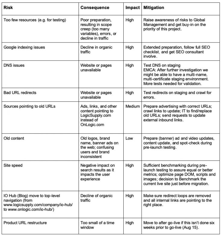 Many of the risks we faced revolved around implementation uncertainty and resource allocation on the IT side. Of the risks that were introduced, the one that I had the most reservations about was migrating our blog to a new URL path. This was decided to be too much of a risk, and we removed it from the initial plan.