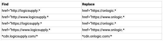 Objective: update all links on the site’s content to point to the new domain. Below is the “find/replace” table that our IT team used to help us update all the content for the transition to onlogic.com: