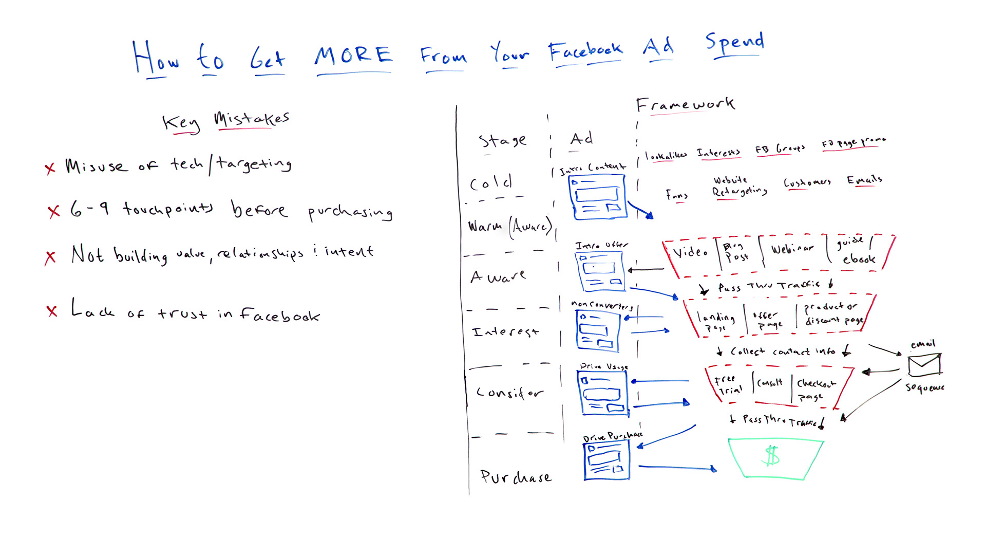 This is the framework that I have drawn up over here. It looks like your traditional marketing funnel. It's got your awareness, interest, consideration, and purchase. But what's in it is specific to this process and Facebook ads in particular.
