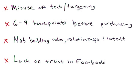 - The misuse of Facebook technology. What that means is not having the pixel installed, not using custom conversions, not using a tag management solution to help you out, and not really understanding and using custom audiences the right way, because those are ultimately what make remarketing and really what make this whole funnel thing really drive through. We need to understand and use custom audiences the right way, and I'm going to talk about that in here.