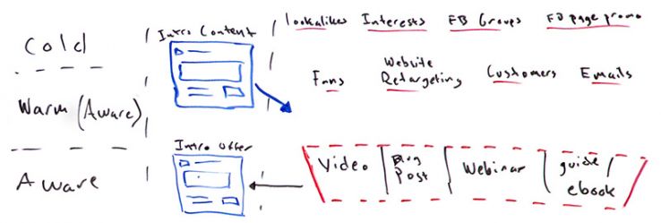This up here, the cold audiences, is where you really start to make your money. So again, lookalike audiences are a tremendous thing. You need to trust in Facebook that what you tell it to do, it's going to go out and find the right people. But there's other stuff you can do as well. Again, because we're not taking a landing page, we can actually go out and do some form of outreach to get more eyeballs on the page. We can go to Facebook groups. We can go to other Facebook Pages. We can say, "Hey, I've got this really great guide, '19 Things To Do to Build Links for Local SEO." We can start to do some exchanges. All we need to do is start getting people to here, getting people to this content, because once they're on this content, they're in our funnel. So let me show you how this works, and this is where the Facebook ads really start to pick up and retargeting really starts to come into play.