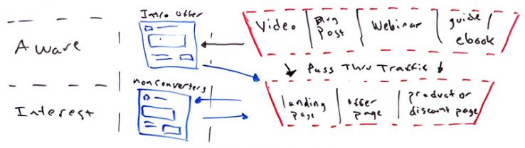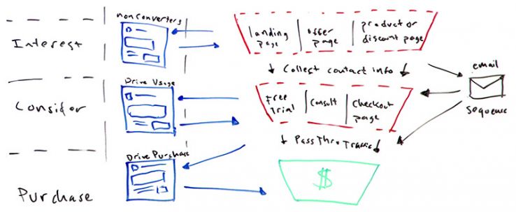 Now I'm going to start actually not at the top. I'm going to run you through the whole thing, but I'm going to start here with interest, because this is where most people start. They build a landing page, a squeeze page that says, "Hey, opt in for our free e-book," and they just start promoting it. They push it to fans. They push it to audiences that they think are interested in it. Unless you're a huge brand that has all of these touchpoints and awareness taken care of, it's very tough because people don't know who you are and they're not just going to start giving you their information and start buying just because you put up a nice landing page.
