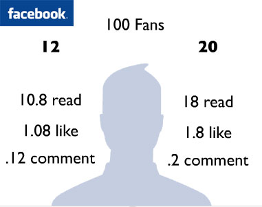 Let's consider that "Heavy Contributors" are those ready to comment on your update, "Intermittent" ones will probably "like" it, and "Lurkers" will read it or just scroll through. Say your page has 100 fans. Knowing the fact that only 12%-20% of all your "Fans" will see your status update in their Live Feed, we can see that: