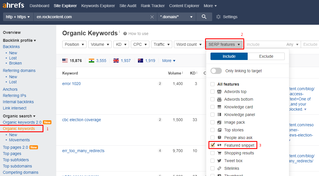The process is largely similar, simply access the “Organic keywords” feature, click on “SERP features” (under “Include”) and select “Featured snippet”.
