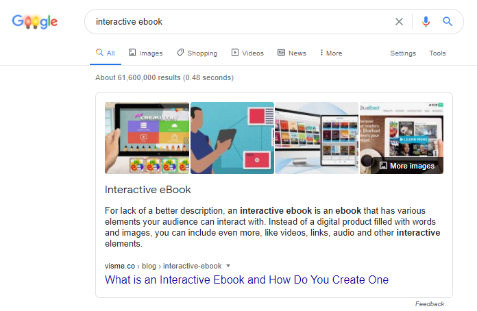 For the keyword “interactive ebook”, we find a paragraph snippet. Below, the SERP presents PAAs on how to make interactive ebooks and the difference between digital books and ebooks.