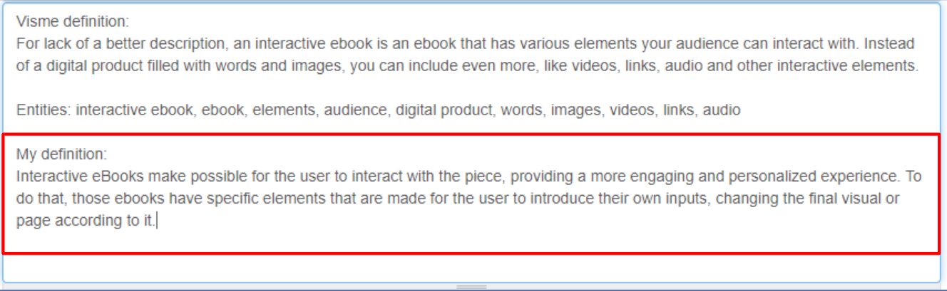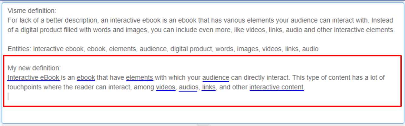 In blue are the entities I decided to use on my new definition. You can also note that this paragraph is a lot shorter than the previous one.