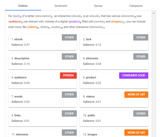 To get the hang of this when starting, you can use Google's own NLP API demo tool or another tool, such as TextRazor, to help you identify it:
