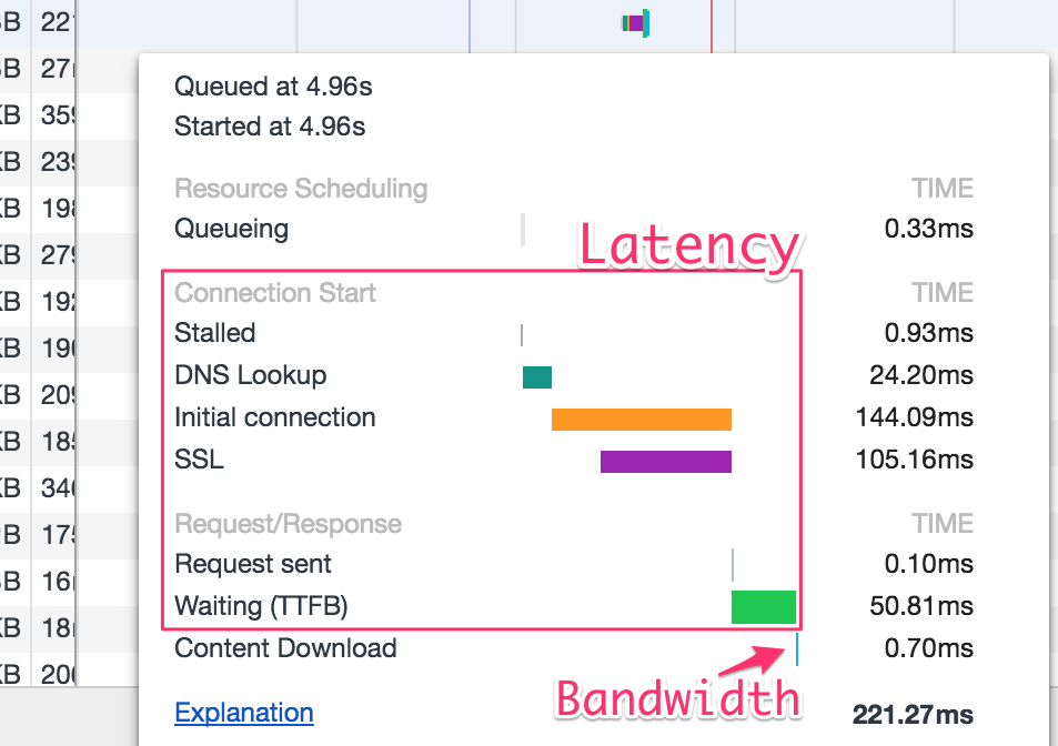 All of the values in the red box are what I’m considering “latency.” They total about 220ms. The actual transfer of content took 0.7ms. No compression or reduction of filesize could help this; the only way to reduce the time taken by the request is to reduce latency.