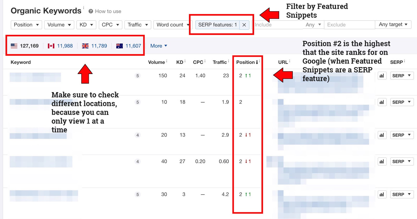Out of the 1.6M monthly organic visits, Ahrefs picks up on 873K organic keywords. When filtering these keywords by SERP features with a featured snippet and ordering by position, you get the following: