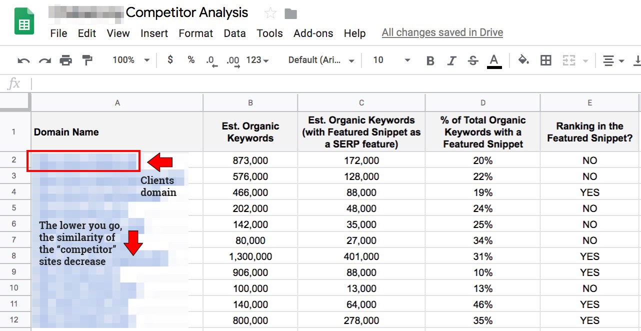 Based on this data, I could see 5 other sites that were similar to my clients. Out of those five sites, only one had results where they were ranking within a featured snippet.