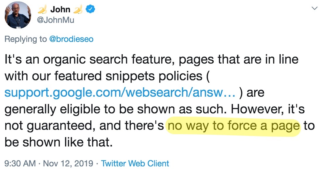I followed up with John on Twitter to see if he was able to get any information from the team on my clients situation. You can follow the link above to see the full piece of communication, but John’s feedback was that there wasn't a manual penalty being put in place for my client's site. He said that it was purely algorithmic. This meant that the algorithm was deciding that the site was not allowed to rank within featured snippets.
