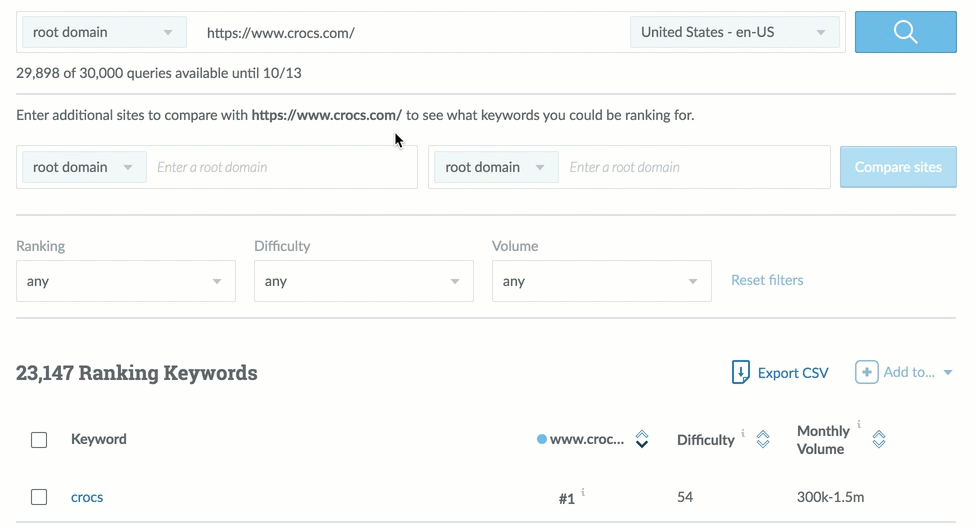So if you search by root domain and you just put in your website into Moz Keyword Explorer, it will show you all of the ranking keywords for that specific domain.