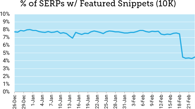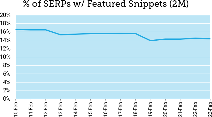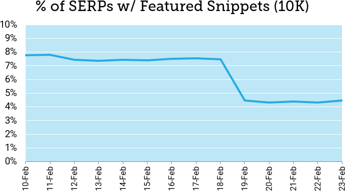 On February 19, MozCast measured a dramatic drop (40% day-over-day) in SERPs with Featured Snippets, with no immediate signs of recovery. Here's a two-week view (February 10-23):