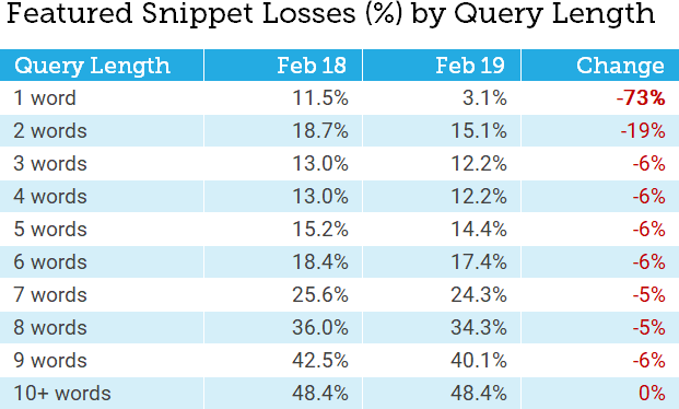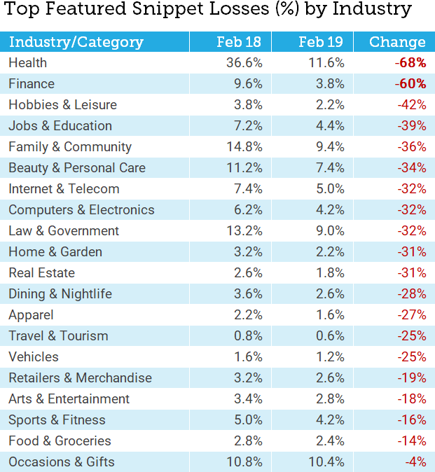 While the 40% drop in Featured Snippets in MozCast appears to be real, the impact was primarily on shorter, more competitive terms and specific industry categories. For those in YMYL categories, it certainly makes sense to evaluate the impact on your rankings and search traffic.