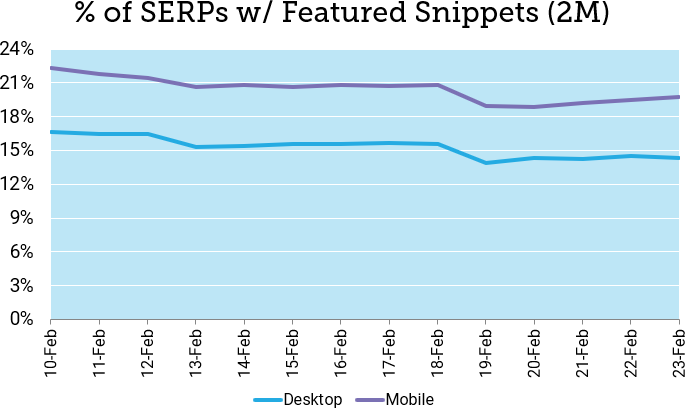 While mobile SERPs in STAT showed higher overall prevalence, the pattern was very similar, with a 9% day-over-day-drop on February 19 and a total drop of about 12% since February 10. Note that, while there is considerable overlap, the desktop and mobile data sets may contain different search phrases. While the desktop data set is currently about 2.2M daily SERPs, mobile is closer to 1.7M.