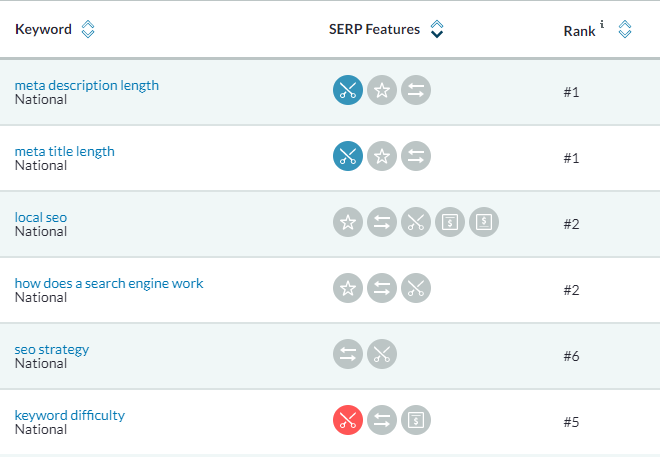 For Moz Pro customers, remember that you can easily track Featured Snippets from the "SERP Features" page (under "Rankings" in the left-hand nav) and filter for keywords with Featured Snippets. You'll get a report something like this — look for the scissors icon to see where Featured Snippets are appearing and whether you (blue) or a competitor (red) are capturing them: