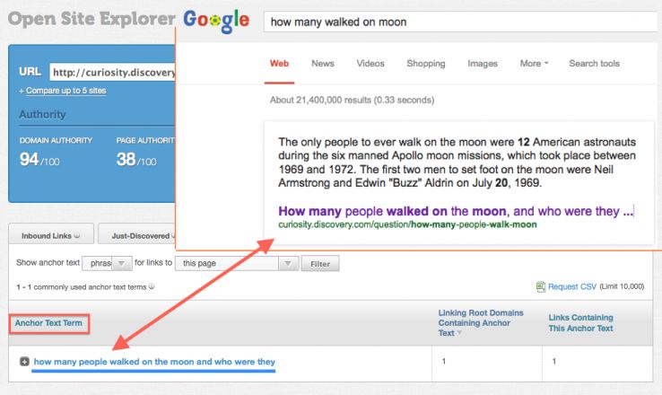 When looking at Google answer box results, you almost always find related keyword-rich anchor text pointing to the referenced URL. Ask Google "How many people walked on the moon?" and you'll see these words in the anchor text that points to the URL Google displays as the answer.