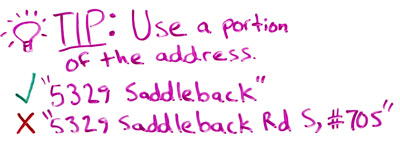 An important tip here with the addresses is that you don't want to use the full address. Let's say for example your address is 5329 Saddleback Road South, Suite 705. Don't put in the whole thing. You put that in quotes, it's only going to match pages that are an exact match with that. Just put in that portion that's going to be common to all the sites, like 5329 Saddleback.