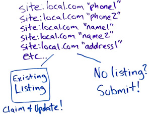 We always double check by running a number of Google searches as well. You'll use the site colon operator in Google. You'll go site:local.com space and put it in quotes, so phone one, phone two, name one, name two, address one.