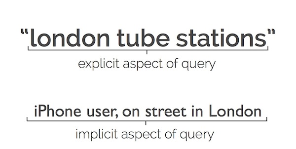 The query consists of the keywords that we explicitly typed in, but also the implicit portion of our request based on our context.