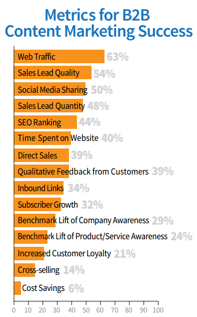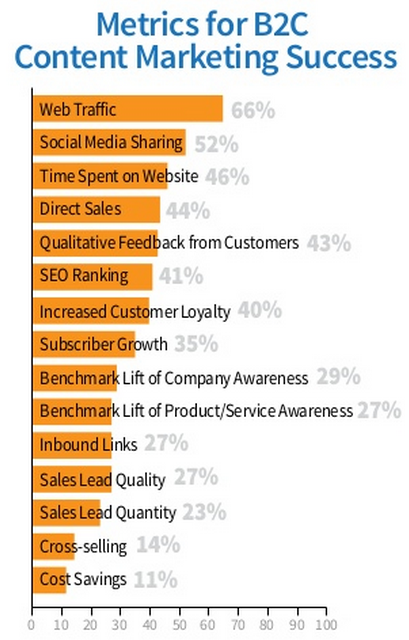 Content Marketing Institute has a great list of key metrics that B2B and B2C companies use to measure the effectiveness of their content.